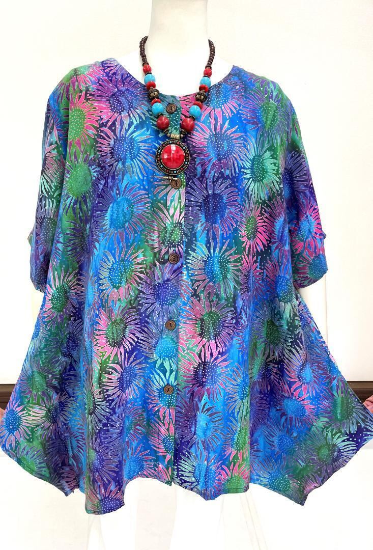 色鮮やかな柄がパッと目を惹く、柔らかな肌触りと、ふわりと軽い着心地は大人の遊び着にぴったり!