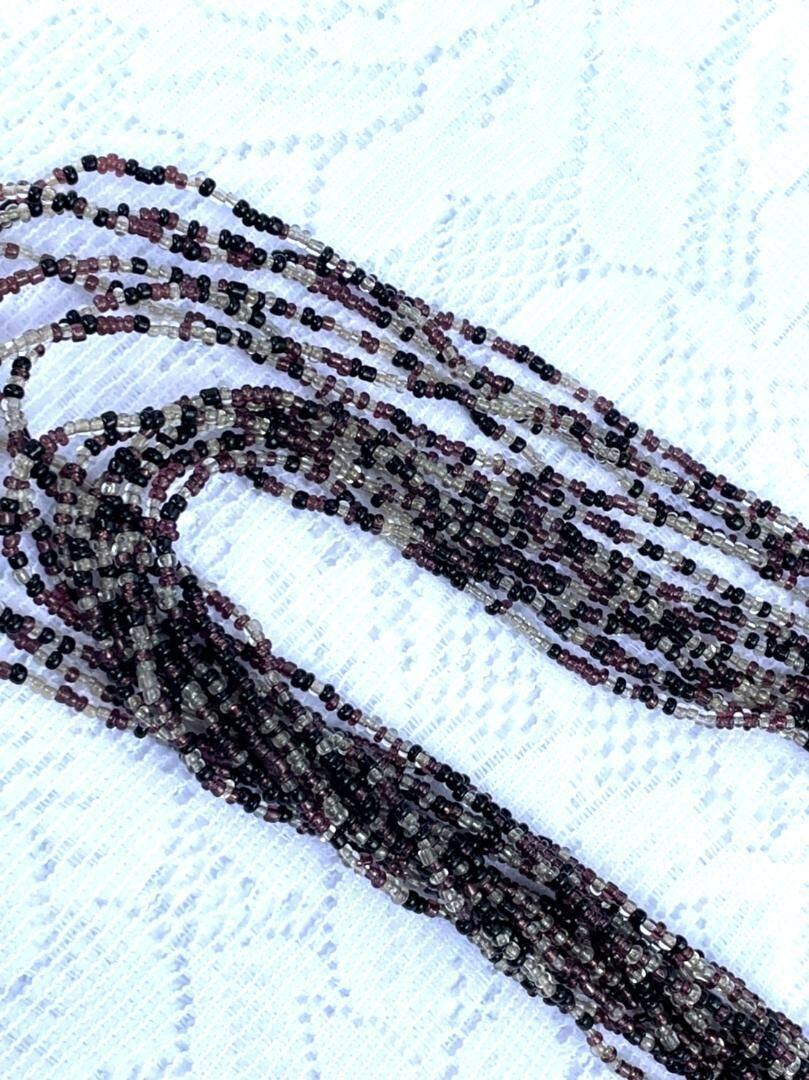 細かなビーズを手作業で一つ一つ紐に通して多連ネックレスです。