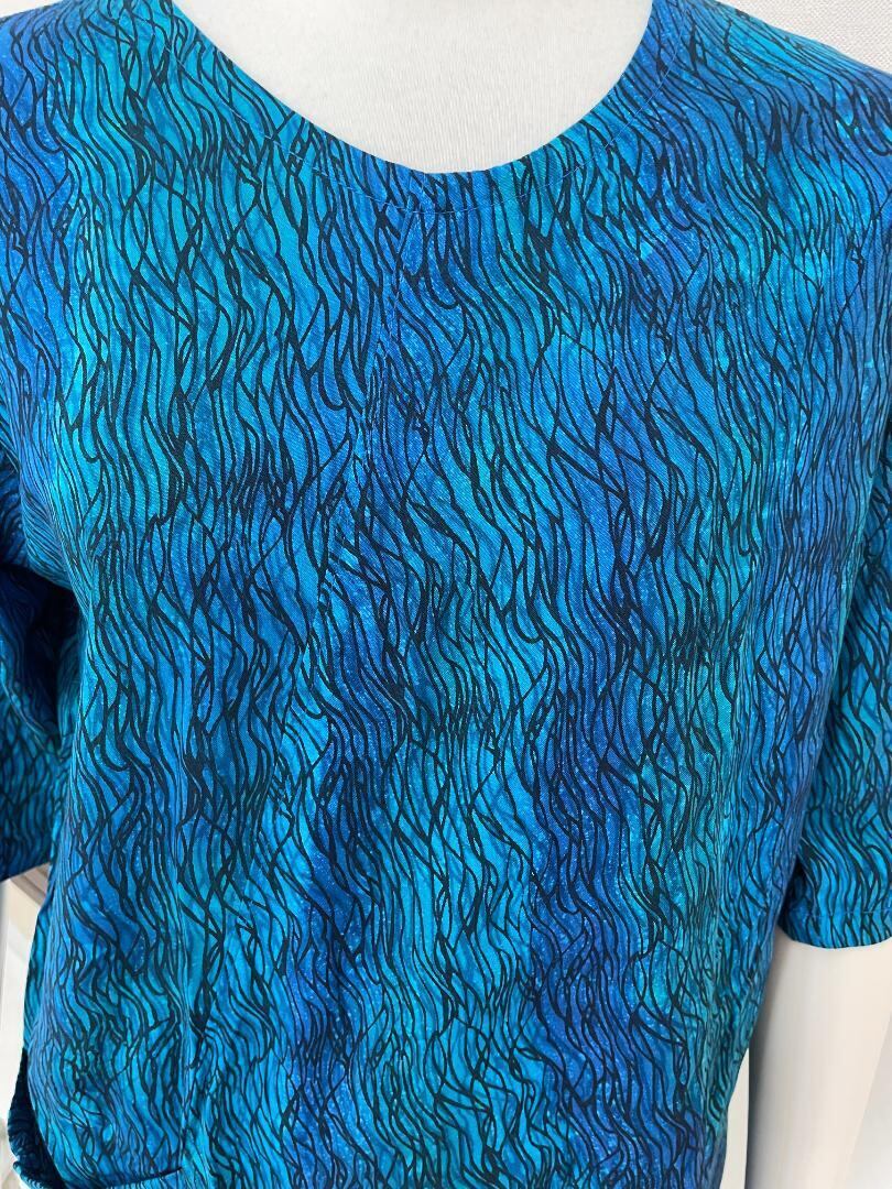ロング丈五分袖チェニックで片外側だけに大きなポケットを付け